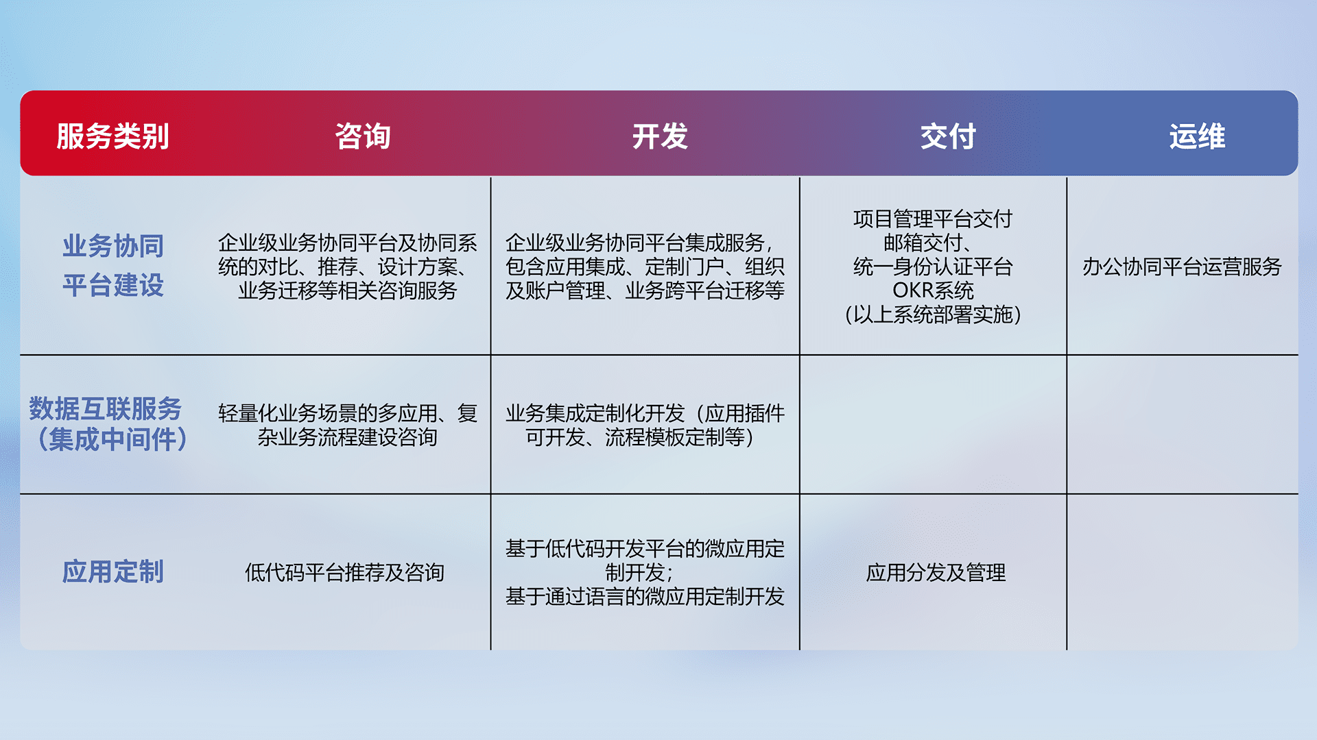 针对钉钉、、、、企微、、、IDaas等平台级产品提供产品的规划、、、方案、、交付、、定制化开发等服务,,实现如统一协同办公、、、智能客户服务、、、混合会议管理、、智能数据查询、、、、等业务场景,,实现数字化转型。。